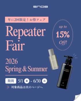 いつも当店をご利⽤頂きましてありがとうございます。 SNOB「リピータ―フェア」についてのご案内です。 ⼤⼈気のサロン専売商品(ヘアケアなど)が対象期間中のご予約にて、全商品10〜15%OFFでご購⼊頂けます! ◎ […]
